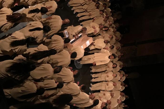 Arrivés de Californie dans le week-end, une centaine. de chanteurs en tenue beige viennent se placer en colimaçon parfait autour d’un piano tout aussi beige. Kanye entre au milieu du cercle, incognito. C’est là qu’on comprend pourquoi on nous a directement conseillé de nous asseoir au premier balcon : les spectateurs du parterre qui se croyaient chanceux au départ verront des dos tournés pendant une heure et demie, et Kanye pendant les dix secondes où il montera sur le piédestal à la place du chef de chœur. « Etes-vous prêts à célébrer Dieu ce matin ? » demande ce dernier. L’assistance dit oui, et pas complètement au second degré.