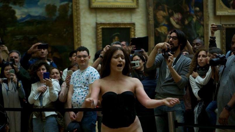 Caméra portative GoPro accrochée sur le front, assise les cuisses écartées et le sexe apparent sur un présentoir en bois installé devant le tableau de La Joconde, la jeune femme de 33 ans avait scandé «Mona Lisa, ma chatte, mon copyright» devant plusieurs dizaines de touristes venus admirer l'œuvre de Léonard de Vinci.