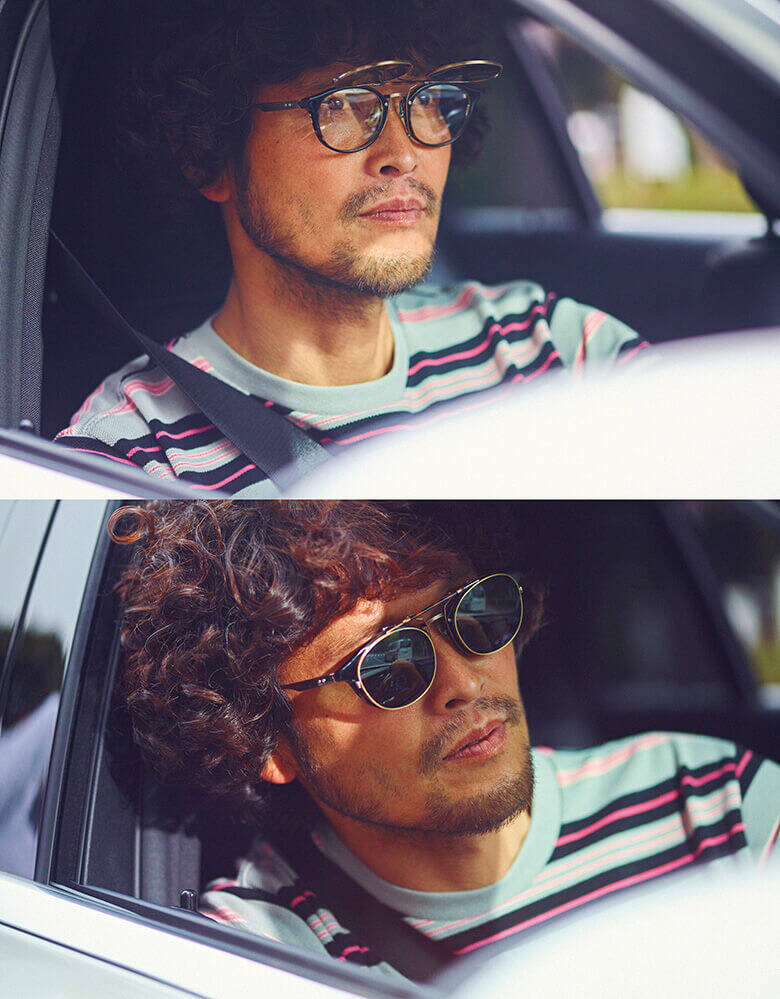 なかでも写真の「M-36」は、クラシカルながらも個性的すぎない適度な丸みのボストンタイプだ。で、オプションの専用クリップオンを装着することで、メガネ↔サングラスの2-WAY仕様に。