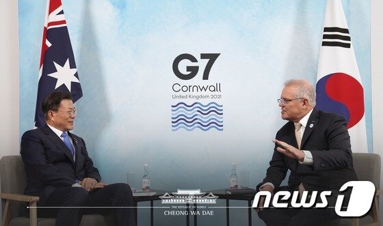 | G7(주요 7개국) 정상회의에 참석 중인 문재인 대통령이 12일(현지시간) 영국 콘월 시내 한 호텔에서 스콧 모리슨(Scott Morrison) 호주 총리와 양자회담을 하고 있다. (청와대 페이스북) 2021.6.12/뉴스1 |