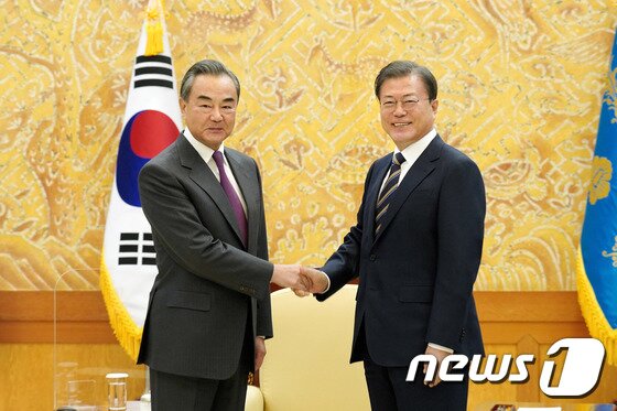 | 문재인 대통령이 26일 오후 청와대에서 왕이 중국 외교부장 겸 국무위원을 만나 악수하고 있다. 2020.11.26/뉴스1 © News1 박정호 기자 |