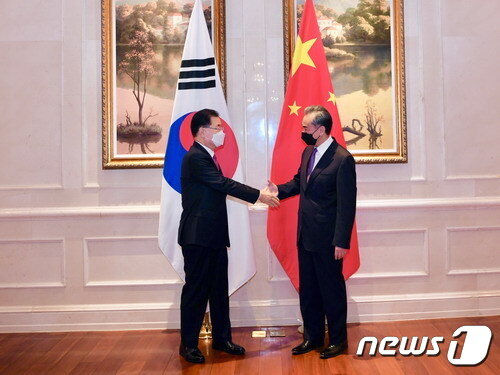 | 정의용 외교부 장관과 왕이 중국 국무위원 겸 외교부장이 지난 3일 중국 샤만 하이웨호텔에서 한중 외교장관회담을 시작 하기 전 악수를 하고 있다.(중국 외교부 제공)© 뉴스1 |
