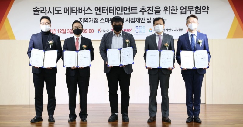 솔라시도 메타버스 엔터테인먼트 추진 업무협약식. (왼쪽부터) 해남군수 명현관 대리참석, 이용수 퍼피레드 대표이사, 정지성 SOSLAB 대표이사, 채정섭 서남해안기업도시개발 대표이사, 김신 SK증권 사장. / 사진제공= SK증권(2021.12.03)