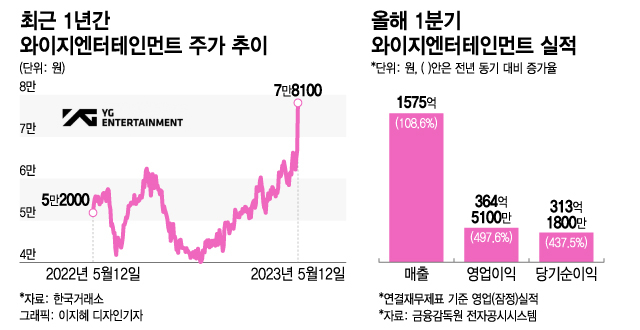 이번 1분기 실적을 발표하면서 주가는 훌쩍 뛰어올랐다. 와이지엔터테인먼트의 1분기 매출액은 전년 동기 대비 108.6% 증가한 1575억원, 영업이익은 497.7% 증가한 364억5100만원을 기록했다. 이는 영업이익 기준으로 시장 기대치를 크게 상회한 '어닝 서프라이즈'였다.