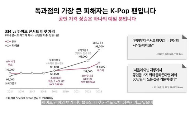 장 이사도 이를 지적하며 "SM은 문화공연을 다양한 팬층이 누릴 수 있도록 공연 티켓 가격을 합리적으로 책정하고 있다. 이에 반해, 하이브는 최근 K-Pop 시장 내 지위를 이용해 콘서트 티켓 가격을 두 배 가까이 올려 언론에서도 여러차례 다뤄진 바 있다"라고 언급했다.